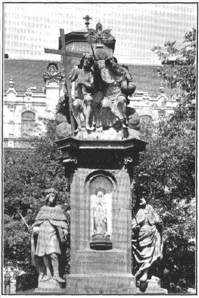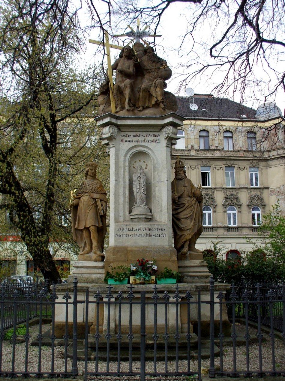 Ennek köszönhetően a korábbi szobrot 1712-ben Újlak (Neustift) elöljáróságának ajándékozták. Itt rövidesen felállították az akkor Felsővásár- , majd az emlékoszlopról elnevezett Szentháromság téren (1900. óta Zsigmond tér). Az 1700-as és 1800-as években nagyszámú javításon, restauráláson esett át. Az 1850-es években a tér és a belé torkoló utcák rendezése kisebb áthelyezést, ezzel új alapzatot tett szükségessé, így 1856-ban érte el ma is látható formáját. Ezt az évszámot mutatja a fülke felett a Szentháromsághoz könyörgő és a fülke alatt a Szeplőtelen Szűzhöz fohászkodó latin szöveg nagyobb betűiből kiolvasható „chronosticon” (ami a betűket külön-külön római számként összeadva adja ki az 1856-ot).